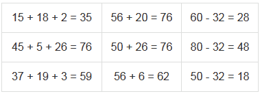 | 15 + 18 + 2 | 56 + 20 | 60 - 32 |