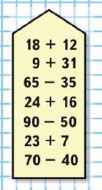 | 18 + 12 = 30 65 - 35 = 30 23 + 7 = 30 70 - 40 = 30 | 9 + 31 = 40 24 + 16 = 40 90 - 50 = 40 |