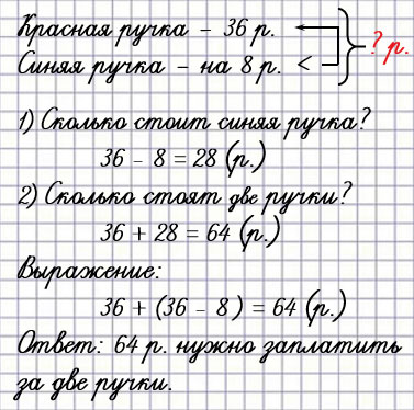 Красная ручка стоит 36 р., а синяя на 8 р. дешевле. Сколько рублей нужно заплатить за две ручки?