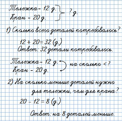 2. Чтобы сделать тележку, Никите потребовалось 12 деталей конструктора, а для подъёмного крана — 20 деталей.