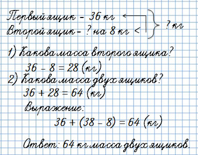 В одном ящике 36 кг бананов, а в другом на 8 кг меньше. Сколько килограммов бананов в двух ящиках?