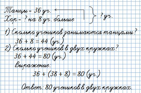 В танцевальном кружке 36 учеников, а в школьном хоре - на 8 учеников больше. Сколько учеников занимаются танцами и пением?