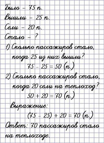 4. На теплоходе было 75 пассажиров. На пристани 25 пассажиров вышли, а 20 сели на теплоход.