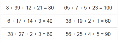 | 8 + 39 + 12 + 21 | 65 + 7 + 5 + 23 |