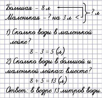33. В ведре столько литров воды, сколько в большой и маленькой лейках вместе. В большой лейке 8 л воды, а в маленькой на 3 л меньше. Сколько литров воды в ведре?
