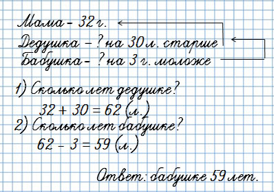 4. Маме 32 года, дедушка старше мамы на 30 лет, а бабушка на 3 года моложе дедушки. Сколько лет бабушке?