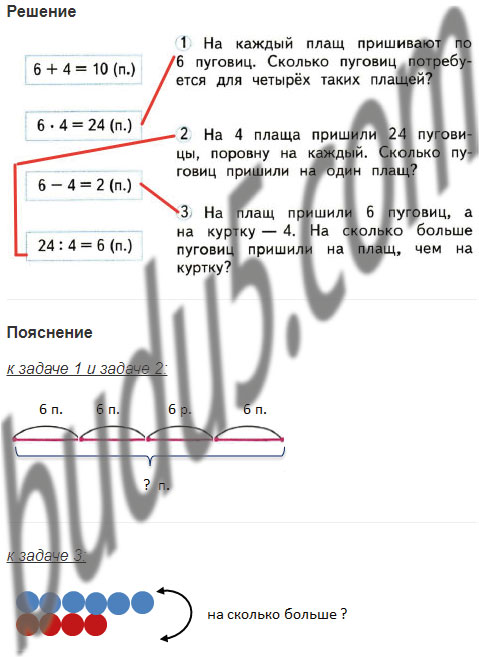 | 1 На каждый плащ пришивают по б пуговиц. Сколько пуговиц потребуется для четырёх таких плащей? |