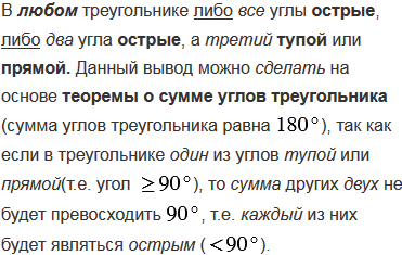 Докажите, что в любом треугольнике либо все углы острые, либо два угла острые, третий тупой или прямой.