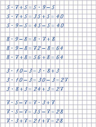| 9 • 8 8 • 9 Проверка 9 • 8 = 72 8 • 9 = 72 72 = 72 | 7 • 5 - 7 7 • 3 + 7 Проверка 7 • 5 - 7 = 28 7 • 3 + 7 = 28 28 = 28 |