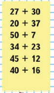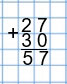| 27 + 30 = 57 20 + 37 = 57 50 + 7 = 57 | 34 + 23 = 57 45 + 12 = 57 40 + 16 = 56 |