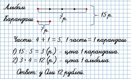 6. Альбом для рисования и карандаш стоят 15 р. На все свои деньги Оля может купить 1 альбом или 4 карандаша. Сколько денег у Оли? Реши подбором.
