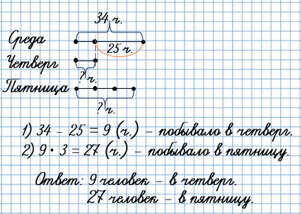 4. В среду в библиотеке побывало 34 человека, в четверг - на 25 человек меньше, а в пятницу - в 3 раза больше, чем в четверг. Объясни, что означают выражения, и вычисли их значения: