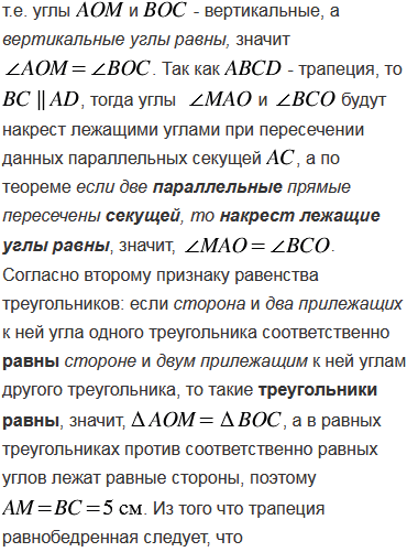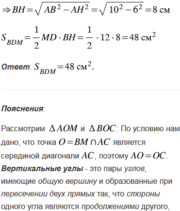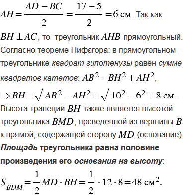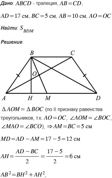 В равнобедренной трапеции ABCD с основаниями AD = 17 см, ВС = 5 см и боковой стороной АВ =10 см через вершину В проведена прямая, делящая диагональ АС пополам и пересекающая основание AD в точке М. Найдите площадь треугольника BDM.