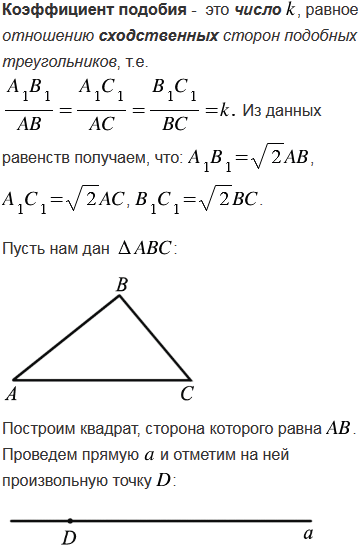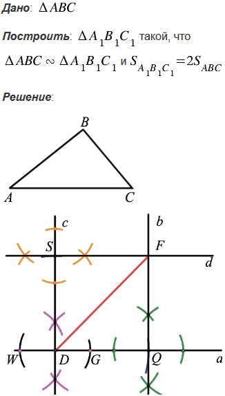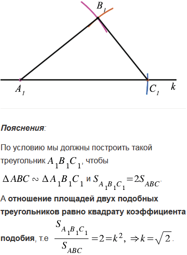 Дан треугольник АВС. Постройте треугольник А1В1С1, подобный треугольнику АВС, площадь которого в два раза больше площади треугольника АВС.