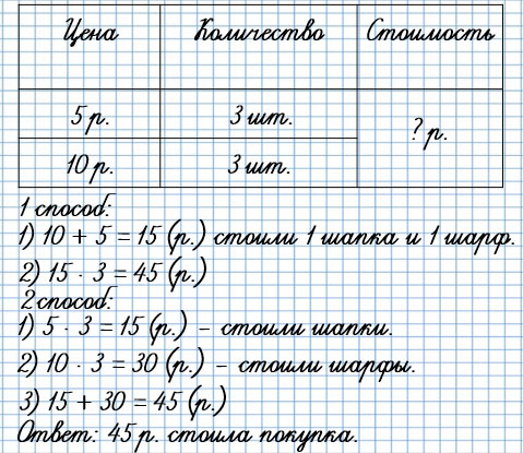 Купили 3 шапки по 5 р. и столько же шарфов по 10 р. Сколько стоила покупка?