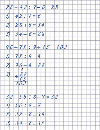 | 28 + 42 : 7 - 6 = 28 + 6 - 6 = 34 - 6 = 28 |