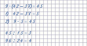| 9 • (42 - 37) = 45 | 96 : 24 = 4 |