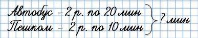 От дома до работы маме нужно ехать 10 мин на автобусе и ещё 5 мин идти пешком. Сколько времени у неё уходит на дорогу от дома до работы и обратно без учёта времени ожидания автобуса?
