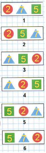 Условно обозначим красный круг цифрой 2, синий треугольник - цифрой 7, а зелёный квадрат - цифрой 5. Составим трёхзначные числа с помощью данных рядов фигур.