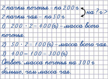 2. Девочка купила 2 пачки печенья, по 200 г каждая, и 2 пачки чая, по 50 г каждая. Задай вопрос и реши задачу.