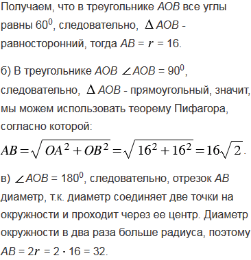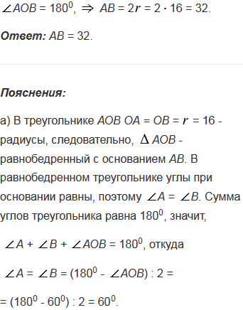 Радиус окружности с центром О равен 16. Найдите хорду АВ, если: а)