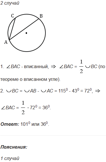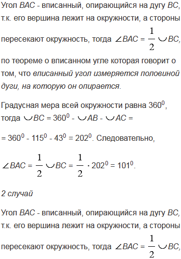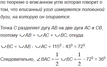 Хорда АВ стягивает дугу, равную 1150, а хорда АС - дугу в 430. Найдите угол ВАС.