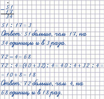 | 51 - 17 = 34 51 : 17 вычисляем путём подбора частного. 17 • 2 = 34, 34 < 51, значит число 2 не подходит; 17 • 3 = 51, 51 = 51, значит число 3 - искомое частное. |