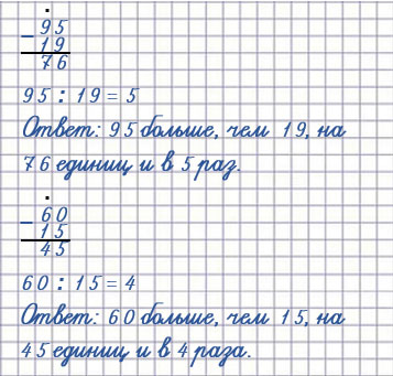 | 95 - 19 = 76 95 : 19 вычисляем путём подбора частного. 19 • 2 = 38, 38 < 95, значит число 2 не подходит; 19 • 3 = 57, 57 < 95, значит число 3 не подходит; 19 • 4 = 76, 76 < 95, значит число 4 не подходит; 19 • 5 = 90, 90 = 90, значит число 5 - искомое частное. |