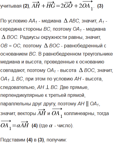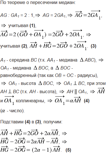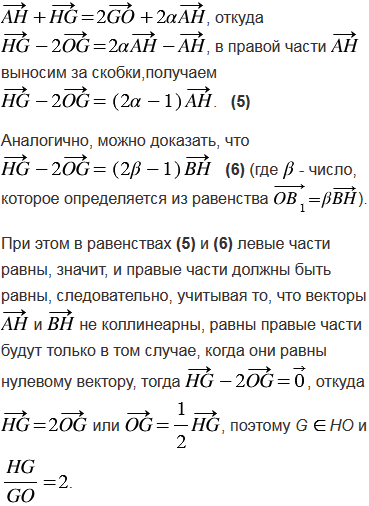 Пусть Н - точка пересечения прямых, содержащих высоты неравностороннего треугольника АВС, а О - центр описанной около этого треугольника окружности. Используя векторы, докажите, что точка G пересечения медиан треугольника принадлежит отрезку НО и делит этот отрезок в отношении 2 : 1, считая от точки Н, т.е. .