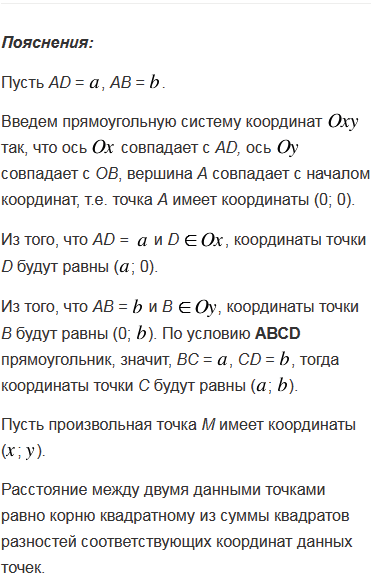 Дан прямоугольник АВСD. Докажите, что для произвольной точки М плоскости справедливо равенство АМ2 + СМ2 = ВМ2 + DМ2.