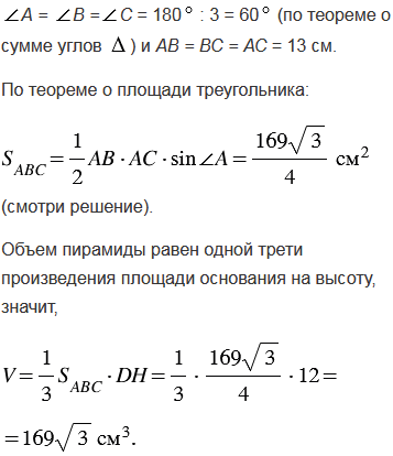 Найдите объем правильной треугольной пирамиды, высота которой равна 12 см, а сторона основания равна 13 см.