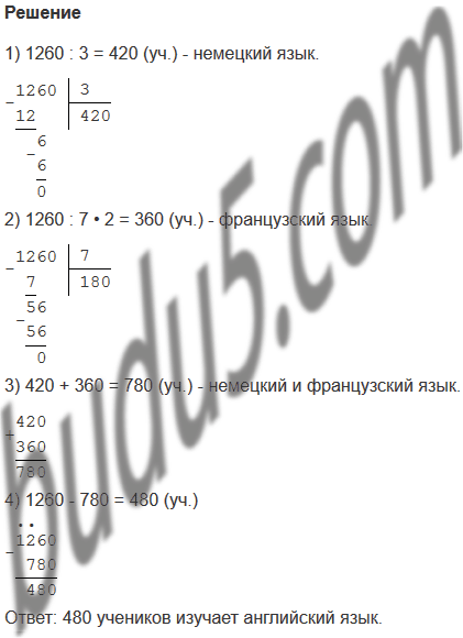 37. В школе 1260 учеников. Одна третья часть всех учеников изучает немецкий язык, две седьмых части всех учеников - французский язык, а остальные ученики - английский. Сколько учеников изучает английский язык?
