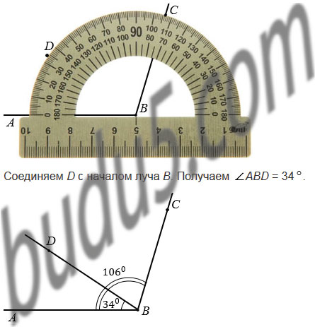 Начертите угол АВС, равный 1060. Лучом ВD разделите этот угол на два угла так, чтобы АВD = 340. Вычислите величину угла DВС.