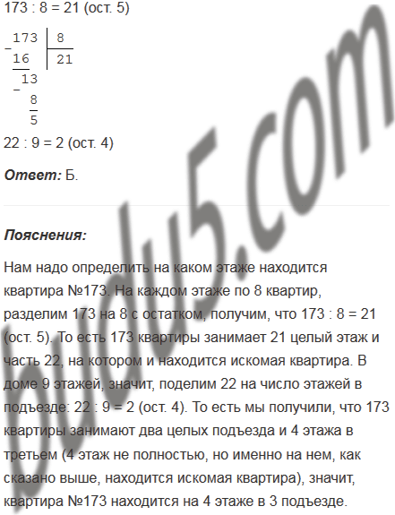 В каждом подъезде на каждом этаже девятиэтажного дома расположено по восемь квартир. Найдите номер этажа, на котором находится квартира №173.