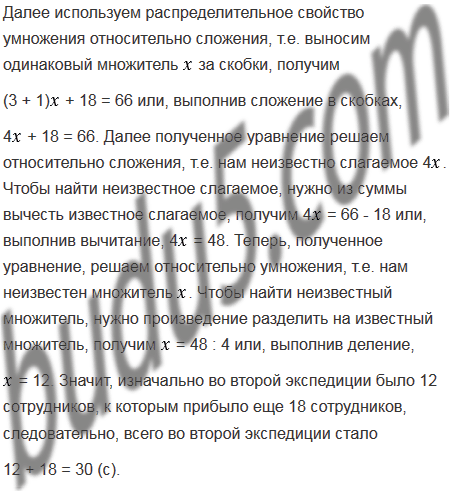 В археологических раскопках древнего города участвовали две экспедиции. В первой было в три раза больше сотрудников, чем во второй. Когда во вторую экспедицию прибыли еще 18 человек, то в двух экспедициях вместе стало 66 сотрудников. Сколько стало сотрудников во второй экспедиции?
