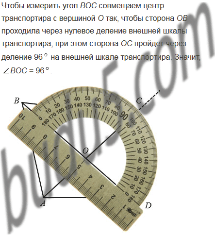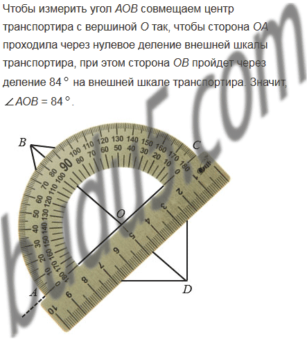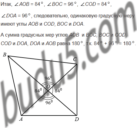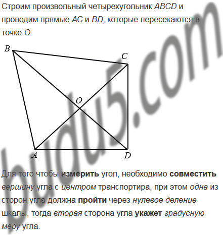 Начертите произвольный четырехугольник АВСD и проведите прямые АС и ВD. Измерьте транспортиром углы АОВ, ВОС, СОD и DОА, где О - точка пересечения прямых АС и ВD. Какие из этих углов имеют одинаковую градусную меру? Сумма градусных мер каких углов равна 1800?