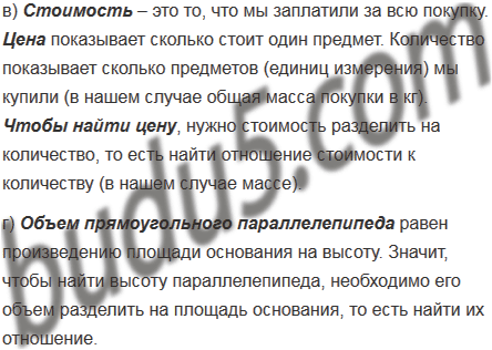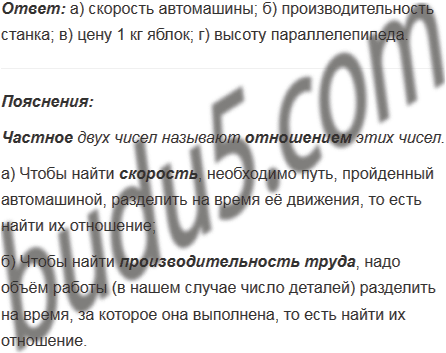 Что показывает отношение: а) пути, пройденного автомашиной, ко времени её движения; б) числа деталей, изготовленных станком-автоматом, ко времени его работы; в) стоимости купленных яблок к их массе; г) объёма прямоугольного параллелепипеда к площади его основания?