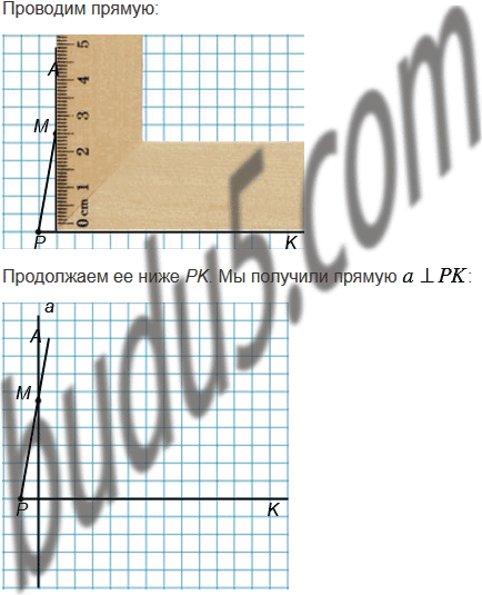 Начертите угол APK, равный 80°. Отметьте на стороне РА точку М и проведите через неё прямые, перпендикулярные сторонам угла АРK.