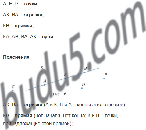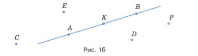 По рисунку 16 назовите: 3 точки, 2 отрезка, прямую и 4 луча.