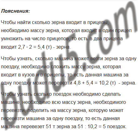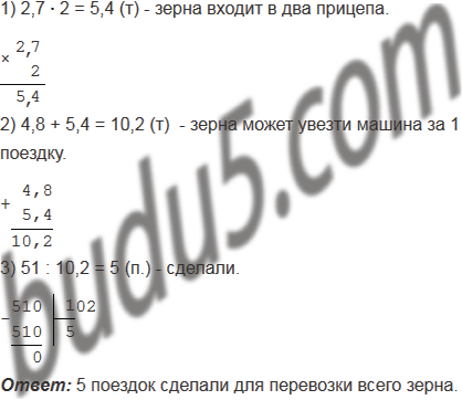 Надо было перевезти 51 т зерна. Зерно перевозили в машине с двумя прицепами. Сколько сделали поездок, если в кузов машины входило 4,8 т зерна, а в каждый из прицепов - 2,7 т?