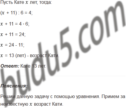 Если число лет Кати увеличить на 11 и полученный результат уменьшить в 6 раз, то будет 4. Сколько лет Кате?