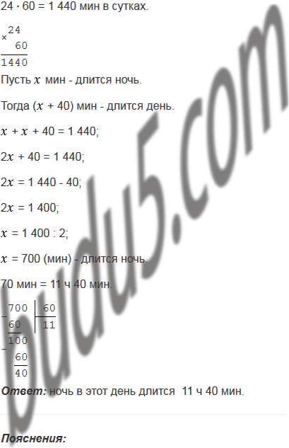 Один раз в год наступают сутки, когда день на 40 мин длиннее ночи. Сколько времени длится ночь в эти сутки?