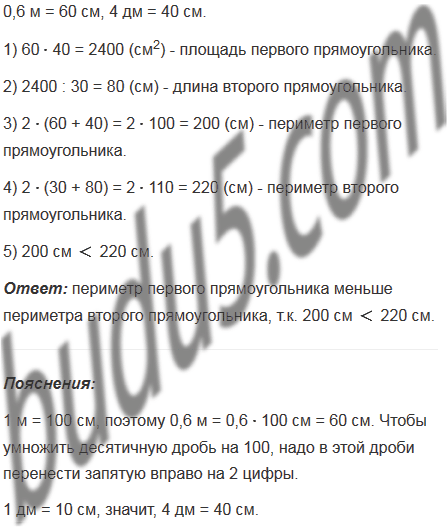 Два прямоугольника имеют одну и ту же площадь. Длина первого прямоугольника равна 0,6 м, а ширина - 4 дм. Чему равна длина второго прямоугольника, если его ширина 30 см? Найдите и сравните периметры этих прямоугольников.