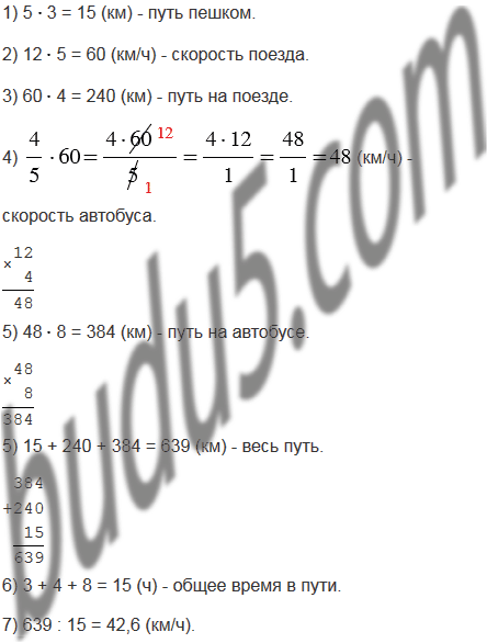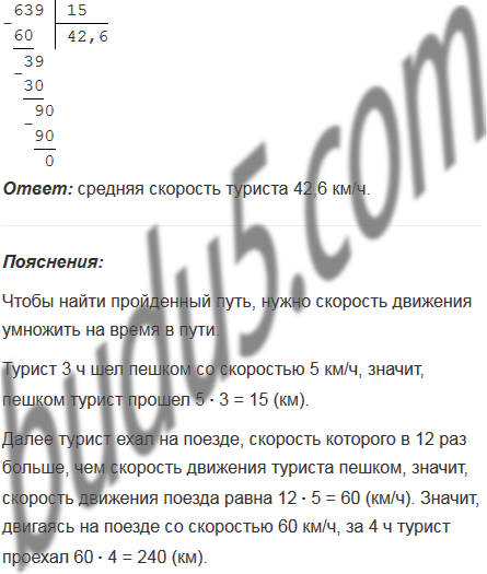 Турист 3 ч шел пешком со скоростью 5 км/ч, а далее 4 ч он ехал на поезде, скорость которого в 12 раз больше. Оставшийся путь турист проехал на автобусе за 8 ч. С какой средней скоростью двигался турист за время путешествия, если скорость автобуса составляла