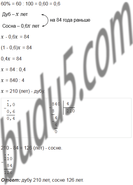 В парке дуб был посажен на 84 года раньше сосны. Сколько лет каждому дереву, если возраст сосны составляет 60% возраста дуба?