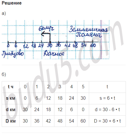 а) Туристы вышли из посёлка Дачное. В каком направлении и с какой скоростью они идут? Построй числовой луч и покажи на нём движение туристов.