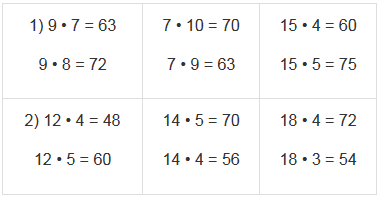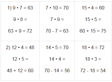 В каждом столбике во втором произведении первый множитель, такой же как в первом произведении в этом столбике, а второй множитель на единицу больше, значит, количество слагаемых во втором произведении будет на одно больше, поэтому, чтобы найти значение второго произведения, нужно увеличить первое произведение на значение первого множителя в этом произведении.