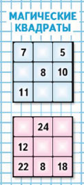 Сложи числа в каждом квадрате по строкам, по столбцам, из угла в угол. Если суммы равны, то такой квадрат называется магическим.