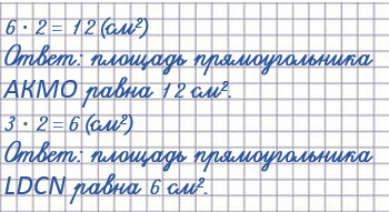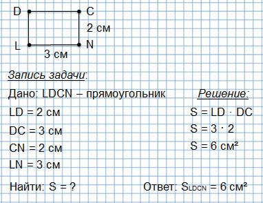 В прямоугольнике LDCN по длине уложилось 3 квадрата площадью 1 см2, а по ширине 2 квадрата площадью 1 см2. Значит, площадь прямоугольника LDCN: