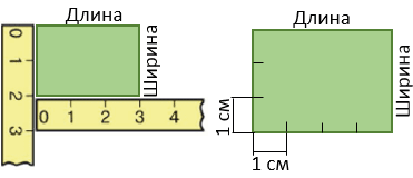 Чтобы вычислить площадь прямоугольника, нужно найти его длину и ширину (в одинаковых единицах), а потом вычислить произведение полученных чисел (площадь будет выражена в соответствующих единицах площади).